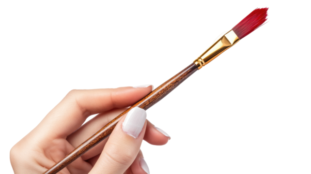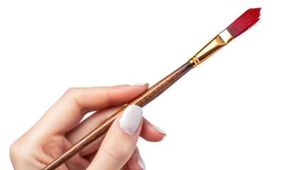 Hand holding paint brush with red paint on transparent background