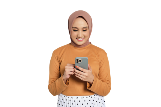 Unimpressed Muslim woman in hijab holding smartphone to cheek with serious expression isolated on transparent background