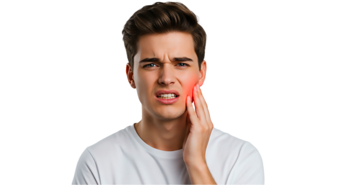 Man with toothache holding his face with red highlight on cheek against black background studio shot
