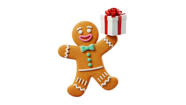 Christmas Gingerbread Man 3D render with green bow tie holding a white gift box with red bow, isolated
