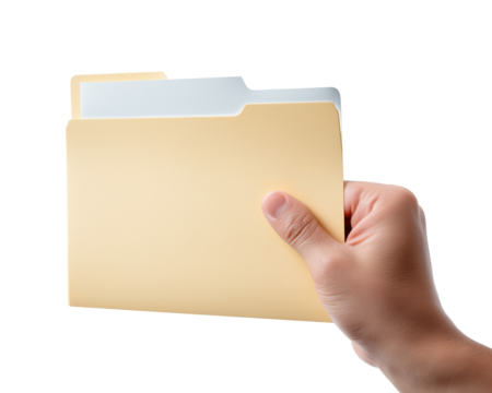 A hand holding a beige file folder with visible white documents  isolated on white and transparent background.