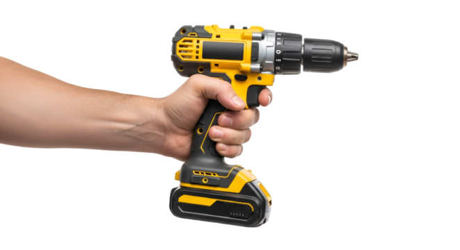 Hand holding cordless drill yellow and black power tool close up view isolated on transparent background