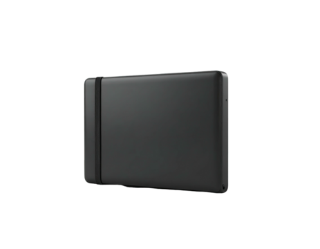 A dark rectangular object on a black background, held together by a band