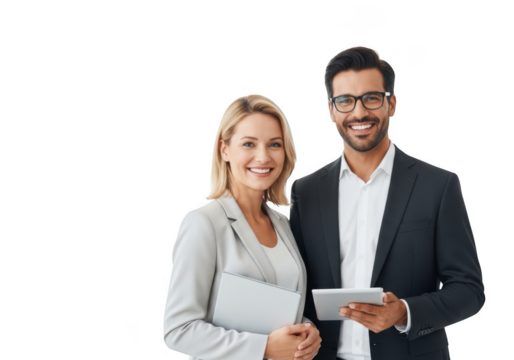 Smiling business colleagues holding tablet and folder isolated on transparent background