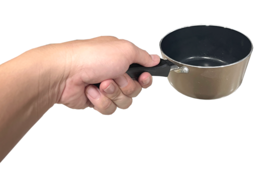 Hand holding a black frying pan for cooking food isolated on transparent background