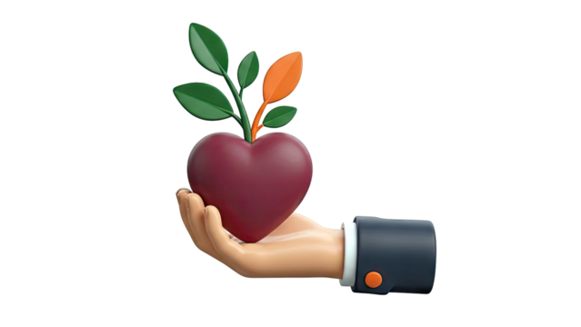 Hand holding a heart with growing leaves
