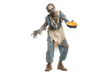 A Halloween zombie holding a pumpkin pie, isolated on a transparent background.