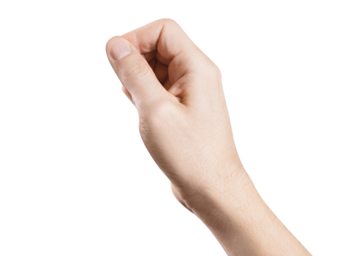 Close-up of a beautiful hand gesturing to pick up or hold a small, invisible object. Isolated on a transparent PNG.