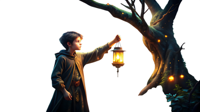 Boy holding lantern near tree isolated on transparent background in fantasy world