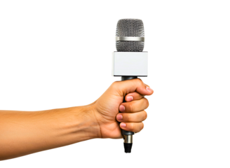 Multiple hands holding microphones with colorful foam covers for an interview or press conference isolated on transparent background