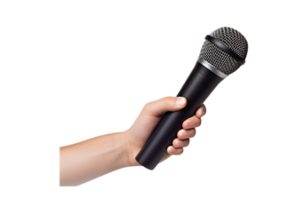 Hand holding a black microphone with a wire, isolated on a transparent background.