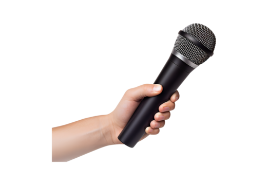 Hand holding a professional black microphone with metallic grille isolated on transparent background. PNG die-cut for advertising