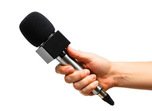 Journalist hand holding microphone for interview isolated on transparent background