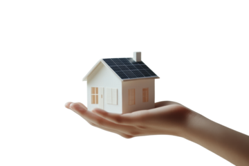 Hand holding house model on coins isolated on transparent background, symbolizing real estate investment and financial growth for a secure future