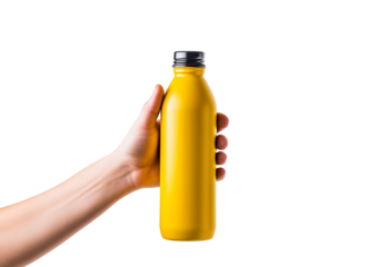 A person holds a bright yellow water bottle with a sleek design, perfect for hydration and outdoor activities.