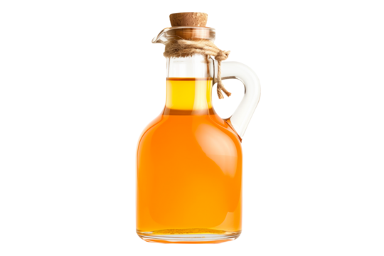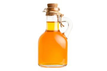 A glass bottle with a cork top holds golden olive oil or apple cider isolated on white transparent