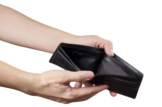 Hands holding an open empty black leather wallet, isolated on transparent background