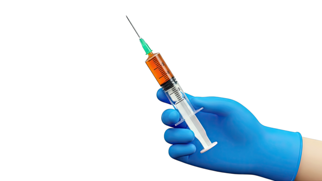 Hand in blue glove holding syringe with orange liquid