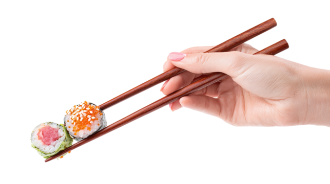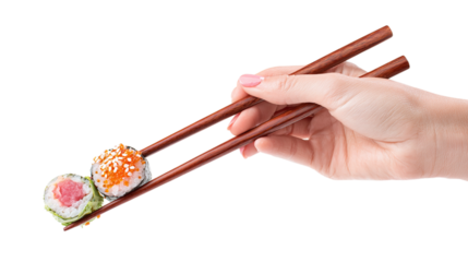 Hand holding chopsticks picking up sushi piece, isolated on tranparent background