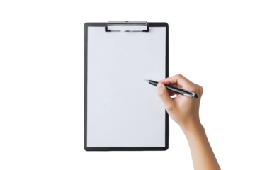 Close-Up of Hand Holding Pen Writing on Clipboard, Top-Down View, Isolated on Transparent Background