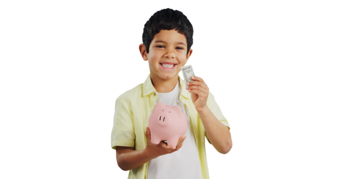 Isolated boy, piggy bank and portrait with money, smile and savings with learning by transparent png background. Child, person and happy with cash for investing, financial security and box for future