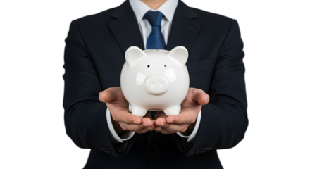 A businessman in a dark suit and tie holds a white piggy bank in his hands, representing financial savings and investment.