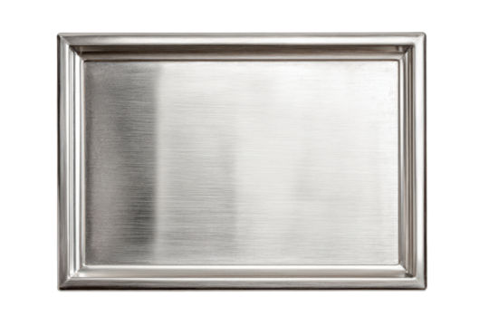 Hand holding empty silver tray isolated on transparent background