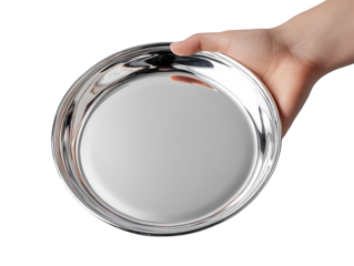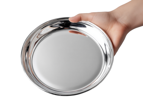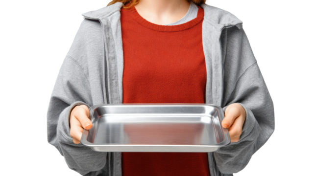Person holding a metal tray, ready to serve delicious food against a white background.