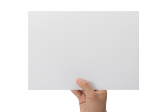 Two hands holding a blank horizontal sheet of white paper or poster card. Isolated on transparent background, png