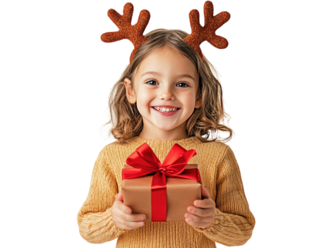 Smiling boy in santa hat holding christmas present on transparent background