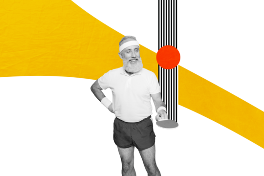 Composite trend artwork sketch image photo collage of line element zebra aged man stand hand hold rocket tennis ball sport gym training