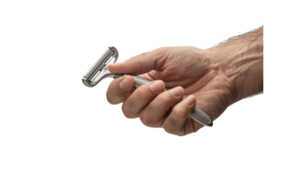 A hand holding a metal razor on white transparent background