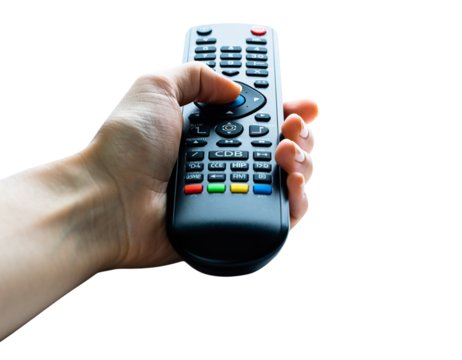 Hand Holding Remote Control Pressing Blue Button Isolated on Black Background finger