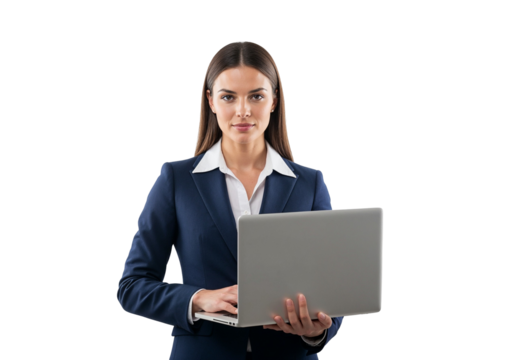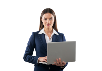 Happy woman participating in an online video call holding a laptop and gesturing, remote working on transparent background