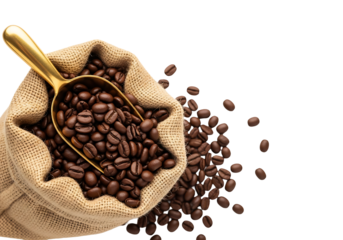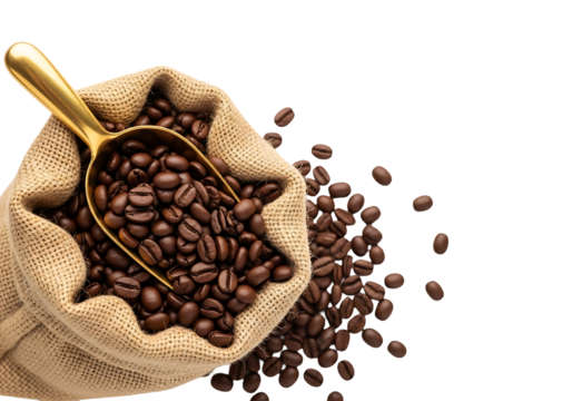 A sack of coffee beans with a spoon, showcasing the rich texture of the beans.
