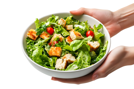 Hand holding bowl of Caesar salad Isolated on white background.