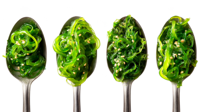 A row of four spoons holding a serving of seaweed salad with sesame seeds.