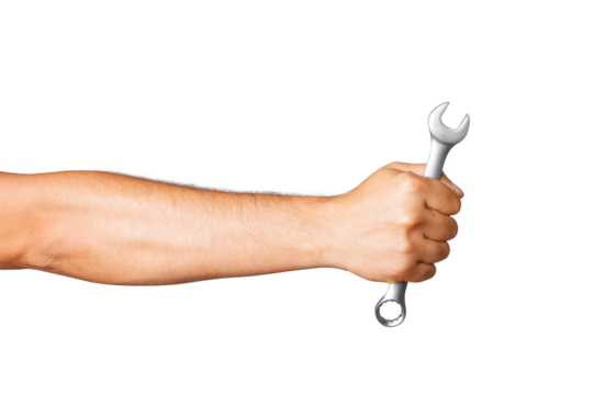 Hand holding a wrench on transparent background, tool isolated and cut-out