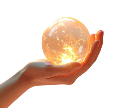 Hand holding clear glass sphere on white background isolated on a transparent background