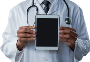Male doctor wearing blue scrubs and stethoscope, holding a tablet and smiling, standing on a transparent background for healthcare concept