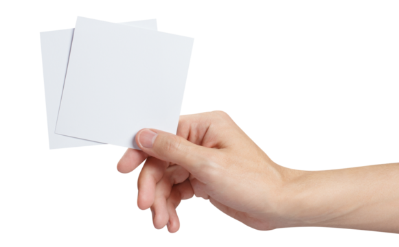 Male hand holding two square blank sheets of paper (tickets, flyers, invitations, coupons, etc.), cut out