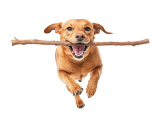 A lively dog joyfully leaps while holding a stick in its mouth, set against a black background.