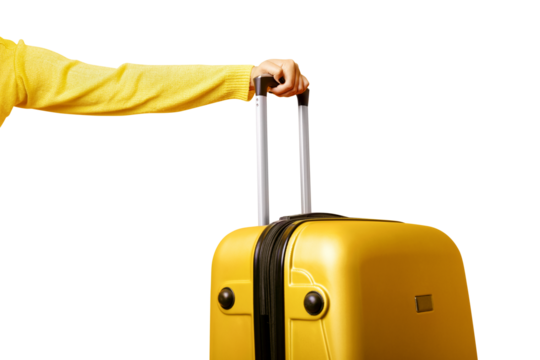 woman holding yellow suitcase in hand isolated on transparent background, travel concept