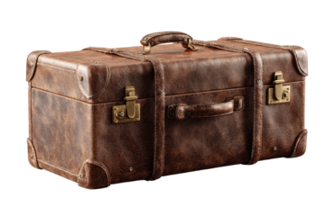 Classic Brown Leather Vintage Suitcase with Straps, Buckles, and Metallic Hardware, Isolated on Black