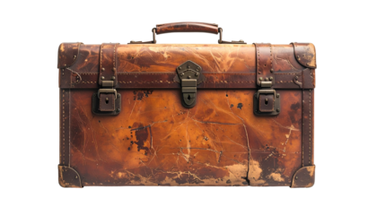 Vintage Brown Leather Suitcase with Metal Accents on Transparent Background