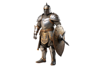 Medieval knight in detailed full plate armor holding a sword and shield isolated on a transparent background
