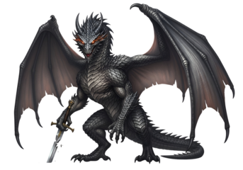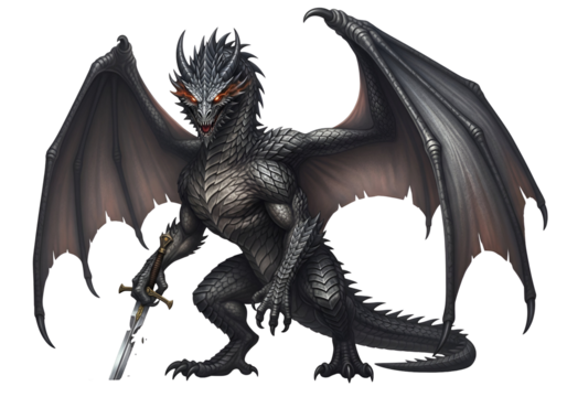A majestic, gray-scaled dragon, wings outstretched, stands proudly holding a sword against a black backdrop.