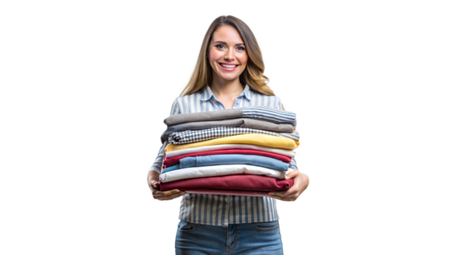 a young woman holding a stack of clean towels on a transparent background, PNG image, PNG file, Generative art.