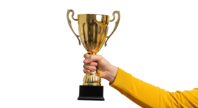 A golden trophy held up by a hand in a yellow sleeve, isolated on a white background