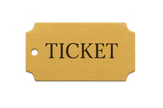 Golden admission ticket with punch hole, offering entry to events, shows, and entertainment on transparent background